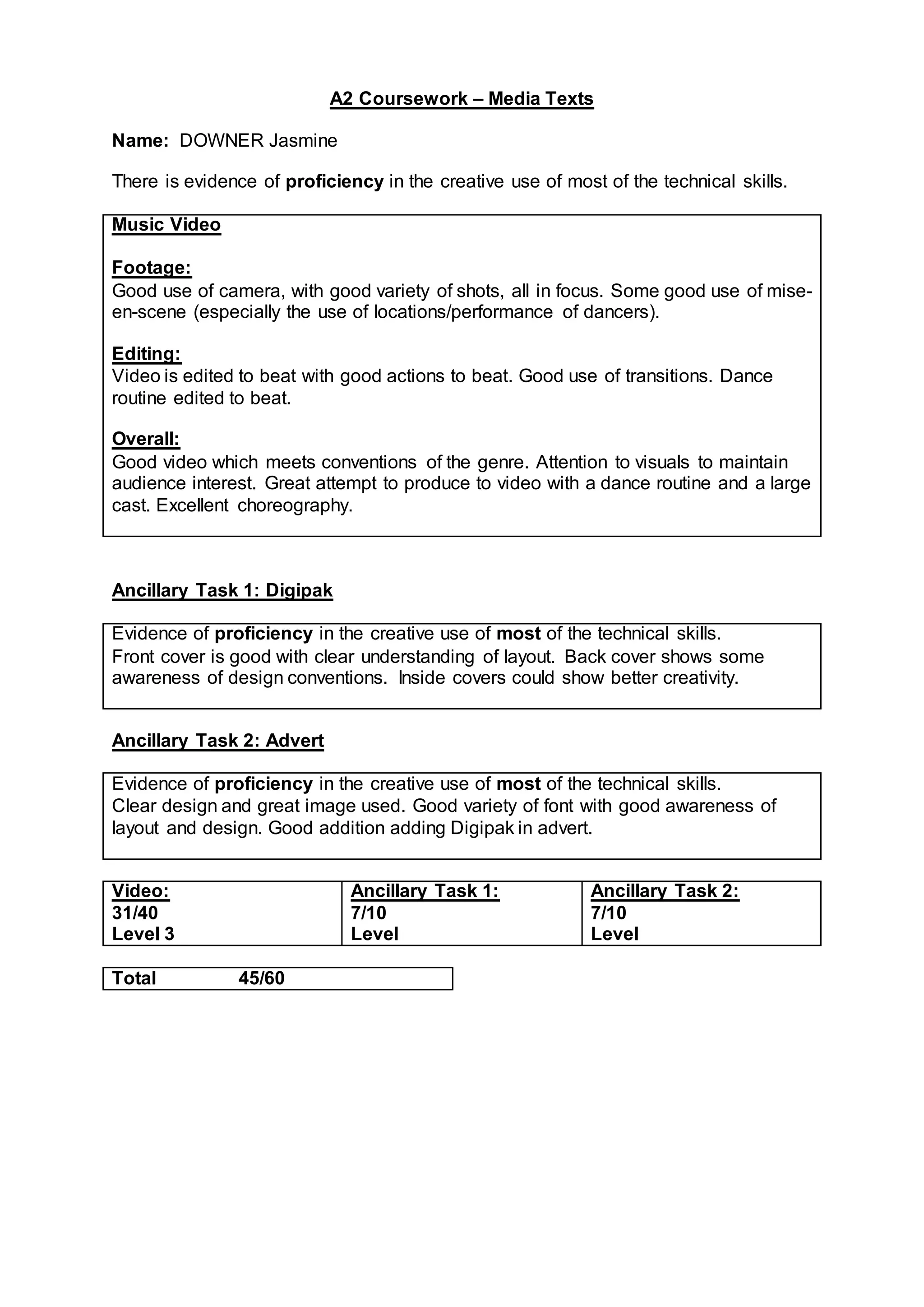 The document provides a summary of Jasmine Downer's A2 coursework, which included a music video, digipak, and advert. The music video received 31/40 and was praised for its camera work, variety of shots, mise-en-scene, editing to the beat, and overall attention to visuals. The digipak cover showed understanding of layout but the inside could be more creative. The advert demonstrated clear design, good use of images and fonts, and awareness of layout. Overall the coursework received a total of 45/60.