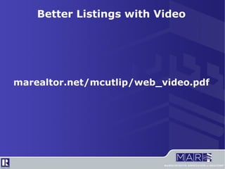 The document provides a comprehensive guide on using video to enhance real estate listings, highlighting its increasing importance in home buying processes. It includes tips on equipment, best practices for shooting and editing video, and methods for online distribution. Additionally, it emphasizes the underutilization of video by agents and offers resources for creating effective real estate videos.