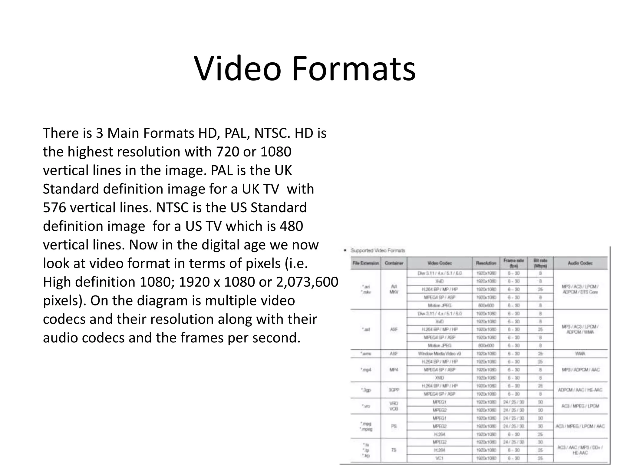 There are three main video formats: HD, PAL, and NTSC. HD has the highest resolution with either 720 or 1080 vertical lines in the image. PAL is the UK standard definition format with 576 vertical lines, while NTSC is the US standard definition format with 480 vertical lines. Formats are now defined by pixel count, such as 1080p with 1920x1080 pixels or 2,073,600 pixels total.