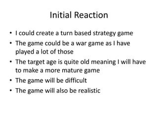 The student plans to create a turn-based strategy war game targeting an older audience. They will produce a mind map and mood board to help plan the game's style and tone. Over 5 weeks, they will experiment with styles, research game types, produce characters and backgrounds, and evaluate their work. Sources of inspiration and research include specific video games like Mario and The Binding of Isaac.