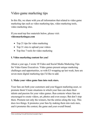 This document provides tips for marketing video games through video marketing. It discusses 7 tips for digital video game marketing, including promoting fans, matching a game's social media voice to its personality, and using paid advertising to promote social media campaigns. It also provides 6 additional tips for general video marketing, such as using branding, including URLs in videos, making impactful titles, providing excellent content, and embedding videos on websites to drive more views.