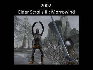 The document summarizes three Elder Scrolls games from 2002, 2012, and a hypothetical 2022 game. It describes The Elder Scrolls III: Morrowind's open world and critical success in 2002. It then discusses The Elder Scrolls V: Skyrim's main story and improved game engine from 2012. Finally, it speculates that Elder Scrolls VII: Daggerfall in 2022 could feature graphics nearly indistinguishable from reality due to advanced processing power.