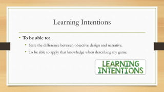 This document discusses narrative and objective design in video game development. It defines narrative as the overall story experience created through plot, gameplay, music, and player choices. Objective design focuses on the goals of the game, such as capturing territory, collecting items, solving puzzles, or building resources. Several examples are provided to illustrate strong narrative games like The Last of Us and The Wolf Among Us, as well as common objective-based goals such as territorial control, collection, and chase/race scenarios.