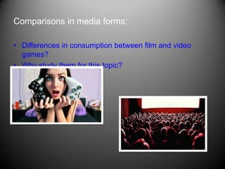 This document discusses the regulation of contemporary media, specifically comparing video games to film and outlining some of the same debates around their active versus passive consumption and issues of censorship. It also outlines the roles of the PEGI and BBFC rating systems in the UK and notes some controversial video game titles and case studies that will be examined.