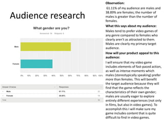 The document contains analysis of questionnaires completed by an audience for a new video game. Several observations are made about the audience: males aged 17-18 make up over half, most play games 1-4 hours per week, and side-scrolling games are the most popular genre. To appeal to this audience, the game will be a side-scrolling shooter featuring fast-paced action, violence, and options for both single-player and multiplayer modes. Interviews with two audience members provided further insights, with one preferring realistic war scenes and the other interested mainly in opposing armies battling. The game will include opposing military forces and a variety of weapons to appeal to both interviewees.