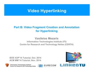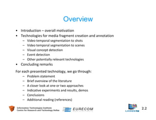 This document discusses technologies for video fragment creation and annotation for the purpose of video hyperlinking. It describes video temporal segmentation to shots and scenes to break videos into fragments. It also discusses visual concept detection and event detection for annotating fragments so meaningful hyperlinks between fragments can be identified. An example approach is described that uses visual features to detect both abrupt and gradual shot transitions with high accuracy at 7-8 times faster than real-time.