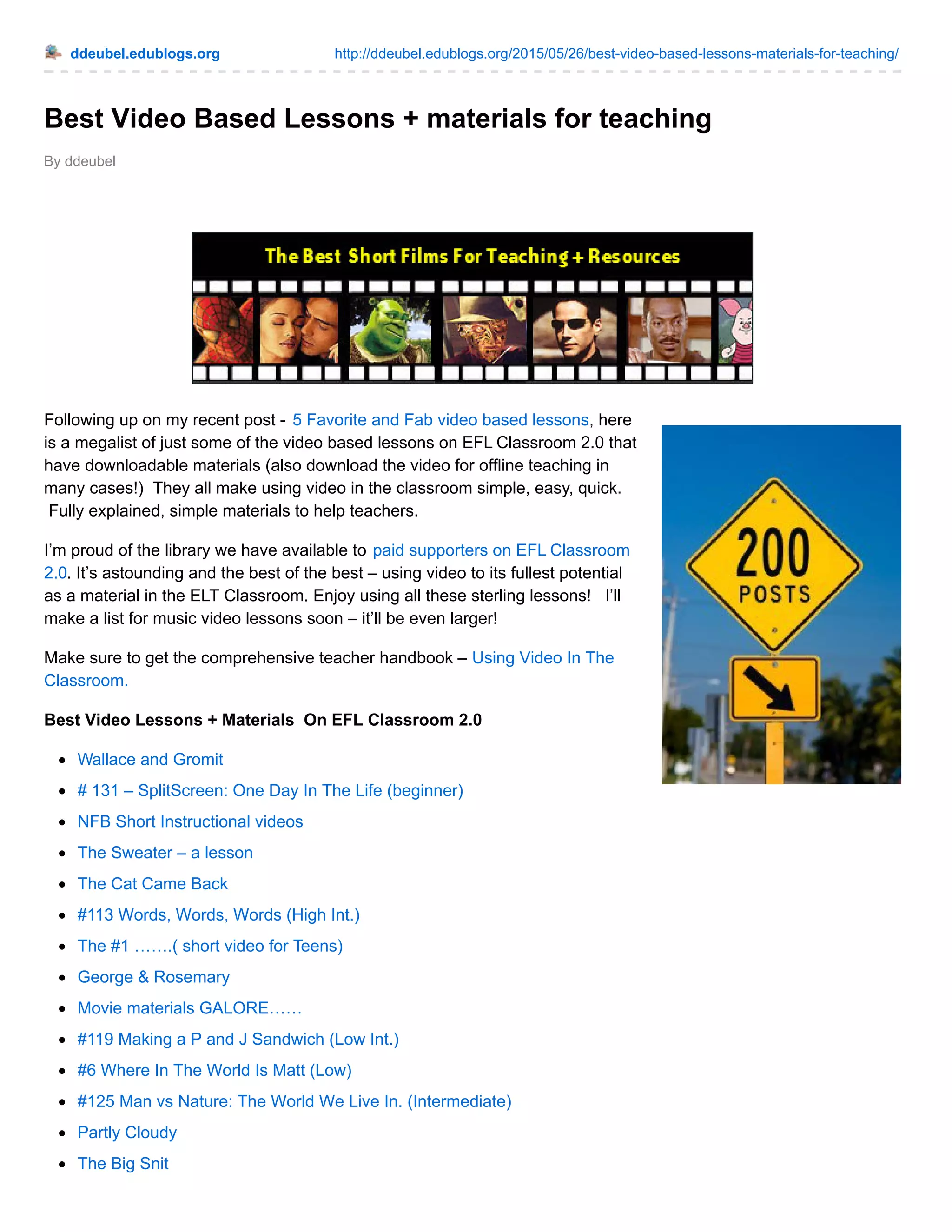 This document provides a lengthy list of video-based English language teaching lessons and materials available on the EFL Classroom 2.0 website. It highlights the large library of lessons that use videos and accompanying downloadable materials to make video-integration in the classroom easy. The lessons cover a wide range of topics, genres and skill levels. Paid subscribers to EFL Classroom 2.0 have access to these lessons designed to maximize the potential of using video as an English teaching material.