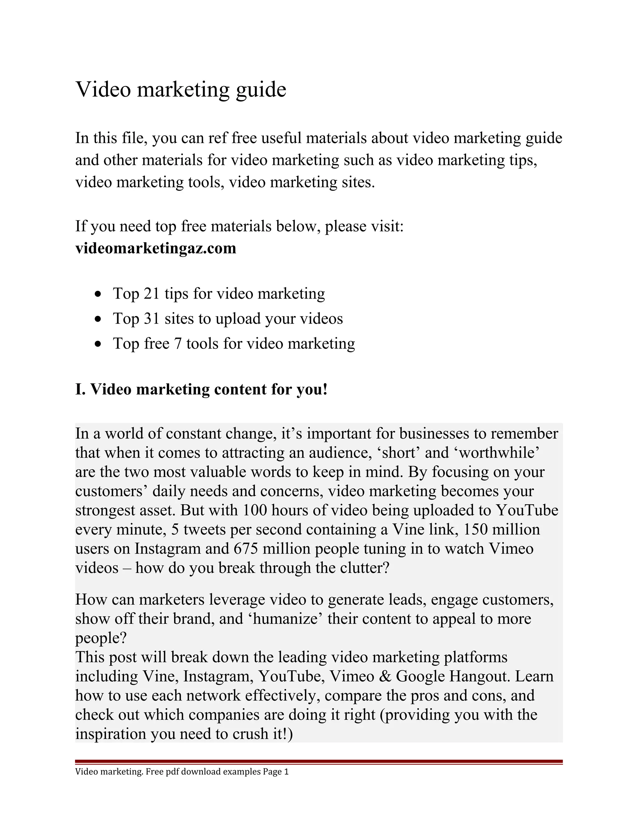 This document provides a guide to video marketing. It discusses various video marketing platforms like Vine, Instagram, YouTube, Vimeo and Google Hangouts. It provides tips for using each platform effectively and compares their pros and cons. It also lists top tips for video marketing, including making titles count, providing excellent content, including your URL in videos, taking advantage of branding opportunities, always providing an HTML link and going beyond YouTube.