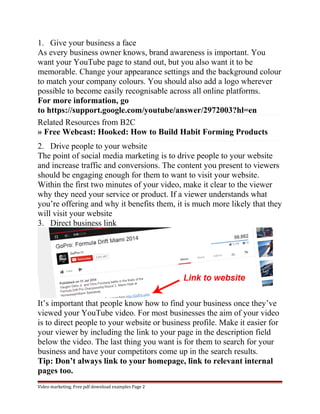 This document provides tips for using video marketing on YouTube. It recommends optimizing video titles with keywords, providing valuable and educational content, including your URL in the video, using branding elements like logos, including a link in the video description, and embedding videos on your own website to drive traffic beyond YouTube. The tips are meant to help videos be discovered and promote your business through video content on YouTube.