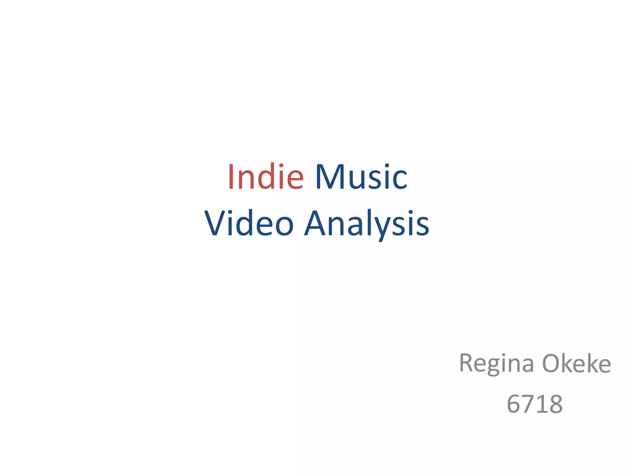The document provides background on indie music videos and analyzes several examples. It finds that indie music videos typically have low budgets and focus on visuals of the artist rather than expensive concepts. Analyzing videos by Jessie Ware, Florence & the Machine, and The Smiths, it identifies several genre characteristics: an emphasis on the relationship between lyrics and visuals; use of lighting, costumes, and editing to match the music; and a voyeuristic treatment of artists that creates mystery rather than overt sexualization. The analyses provide guidance for creating an original indie music video that incorporates these conventions.