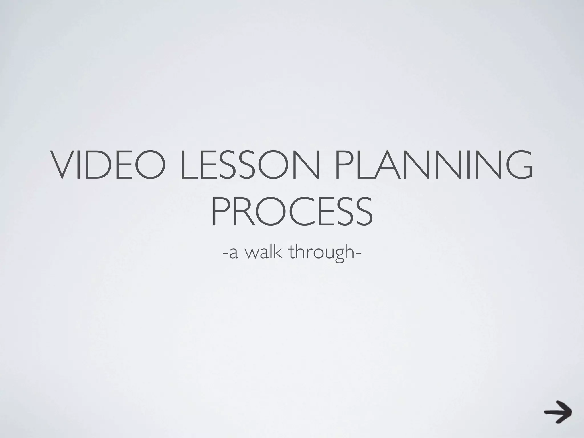 This document outlines the process for planning video lessons, which includes identifying student objectives and assessments, determining the unit essential question and concepts to be taught, developing lesson essential questions, recording and developing the video lesson, and assessing student progress. The process emphasizes understanding the key topics and concepts students should understand, and developing lessons and assessments around those ideas.