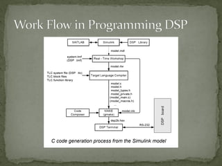This document discusses using MATLAB and a DSP processor for image processing and computer vision applications. It describes how MATLAB can be used to acquire images, analyze image content, and control actuators. However, image processing requires significant computational resources, so the code is run on a computer connected to a webcam rather than a microcontroller. The Texas Instruments TMS320C6713 DSK platform allows MATLAB codes to be implemented on a DSP processor for these types of applications. Example applications mentioned include medical imaging, object recognition, and robotic vision.