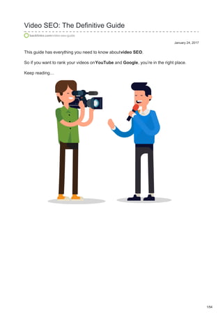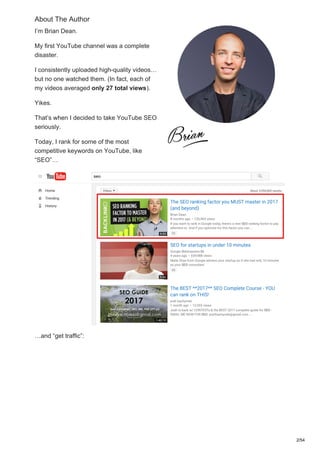 This document provides an overview and summary of a guide about video SEO on YouTube. It discusses optimizing videos for keywords, creating engaging content, and building authority on your YouTube channel to improve video performance and rankings. Specific tips include conducting keyword research, creating long and entertaining videos with calls to action, optimizing video metadata and transcripts, and developing a clear brand identity and messaging for your channel.