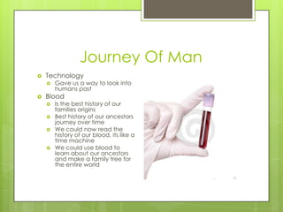 1. The document discusses how analyzing DNA from blood can help trace family histories and human migration patterns over thousands of years, showing our shared ancestry originating from Africa.