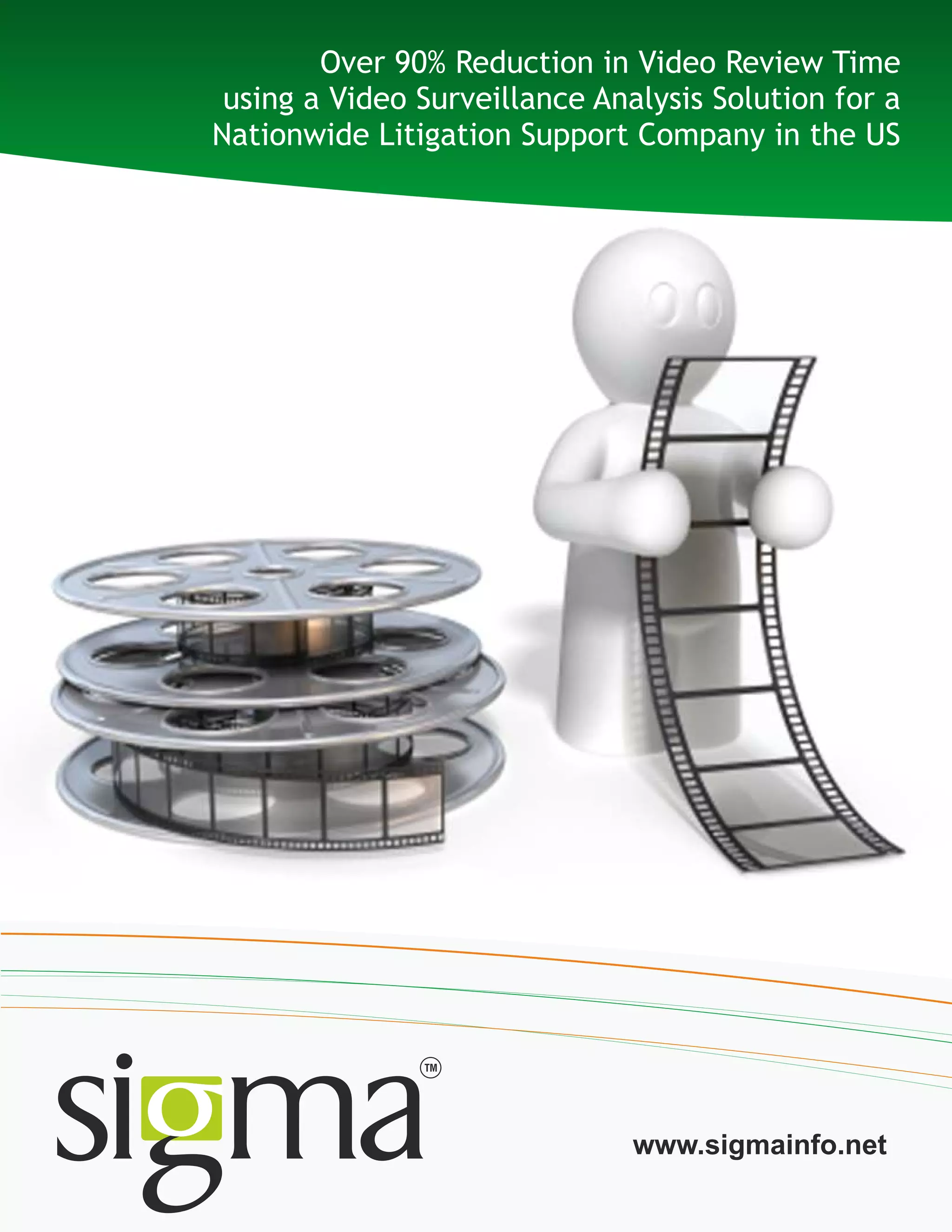 The document discusses a video surveillance analysis solution developed by Sigma Infosolutions for a nationwide litigation support company in the US. The solution helped reduce the time required for video review and tagging by over 90% by automating the manual process of viewing, analyzing, tagging and synchronizing events. This provided significant cost and time savings for building video evidence for litigation cases. The customized solution enabled simultaneous analysis of up to 60 video feeds and flexible tagging of custom events.