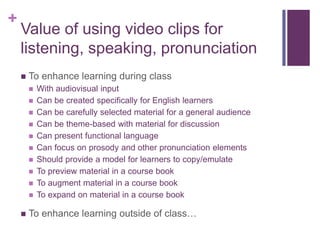 This document discusses using video clips to enhance English language learning for speaking, listening, and pronunciation. It describes how videos can be used both in and outside of class, providing models for learners. It introduces the concept of "flip teaching", which moves lectures outside of class and allows more hands-on learning in class. Examples are given of homemade instructional videos created for language learning, including videos on making s'mores and telling a story in the past tense. Benefits discussed include allowing more review time and collaborative learning opportunities for students.