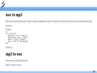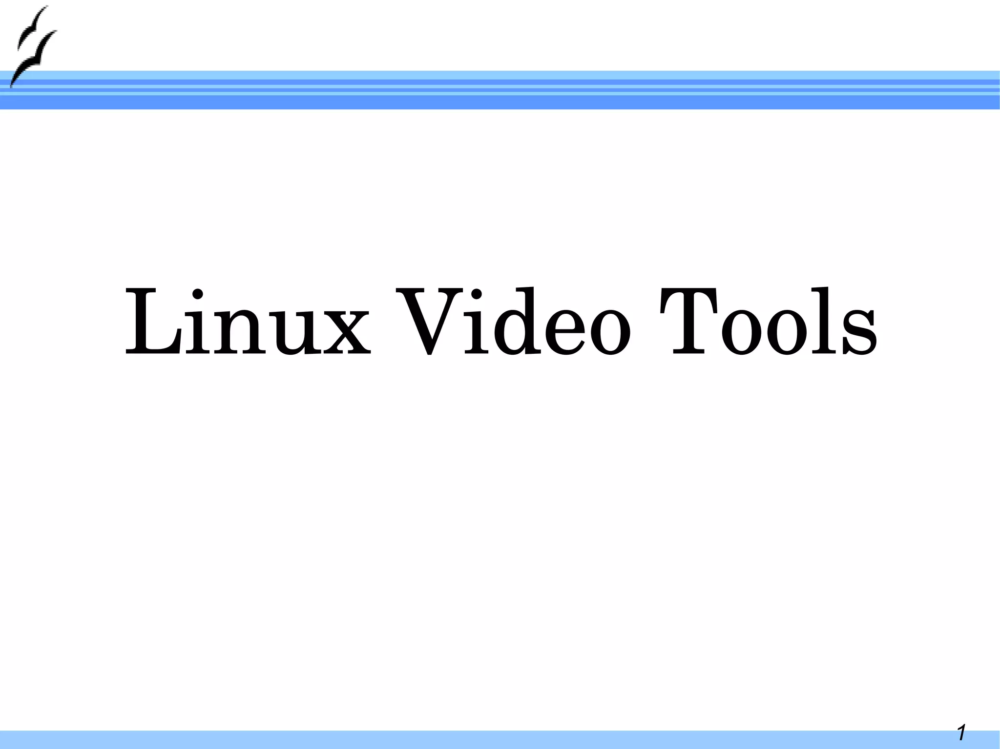 The document provides an overview of Linux video tools including common codecs, formats, containers and editing software. It discusses the key elements of video including codecs, formats and containers. It then summarizes popular codecs for video and audio as well as encoding and editing tools like ffmpeg, Kino and Avidemux. Transcoding examples using ffmpeg to convert between formats are also provided.