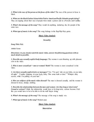 The document provides analyses of 8 music videos based on different themes: gender roles, race, sexuality, materialism, and violence. For the video "Anaconda" by Nicki Minaj, the summary is that it features women dancing sexually while scantily clad and focuses on their bodies. For "My Nigga" by YG, the summary is that it only represents black people and focuses on black pride and solidarity. For "Ride" by Somo, the summary is that it sexually objectifies the female subject and its message is simply about sex.