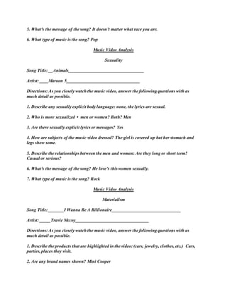 The document contains analyses of music videos focusing on themes of gender roles, race, sexuality, materialism, and violence. It includes questions to guide observation of each video and interpretation of its message. The questions relate to the behaviors, appearances, relationships, and messages portrayed regarding the theme. The videos analyzed address gender role reversal, inclusion of all races, sexual attraction, wealth aspiration, and a volatile romantic relationship.