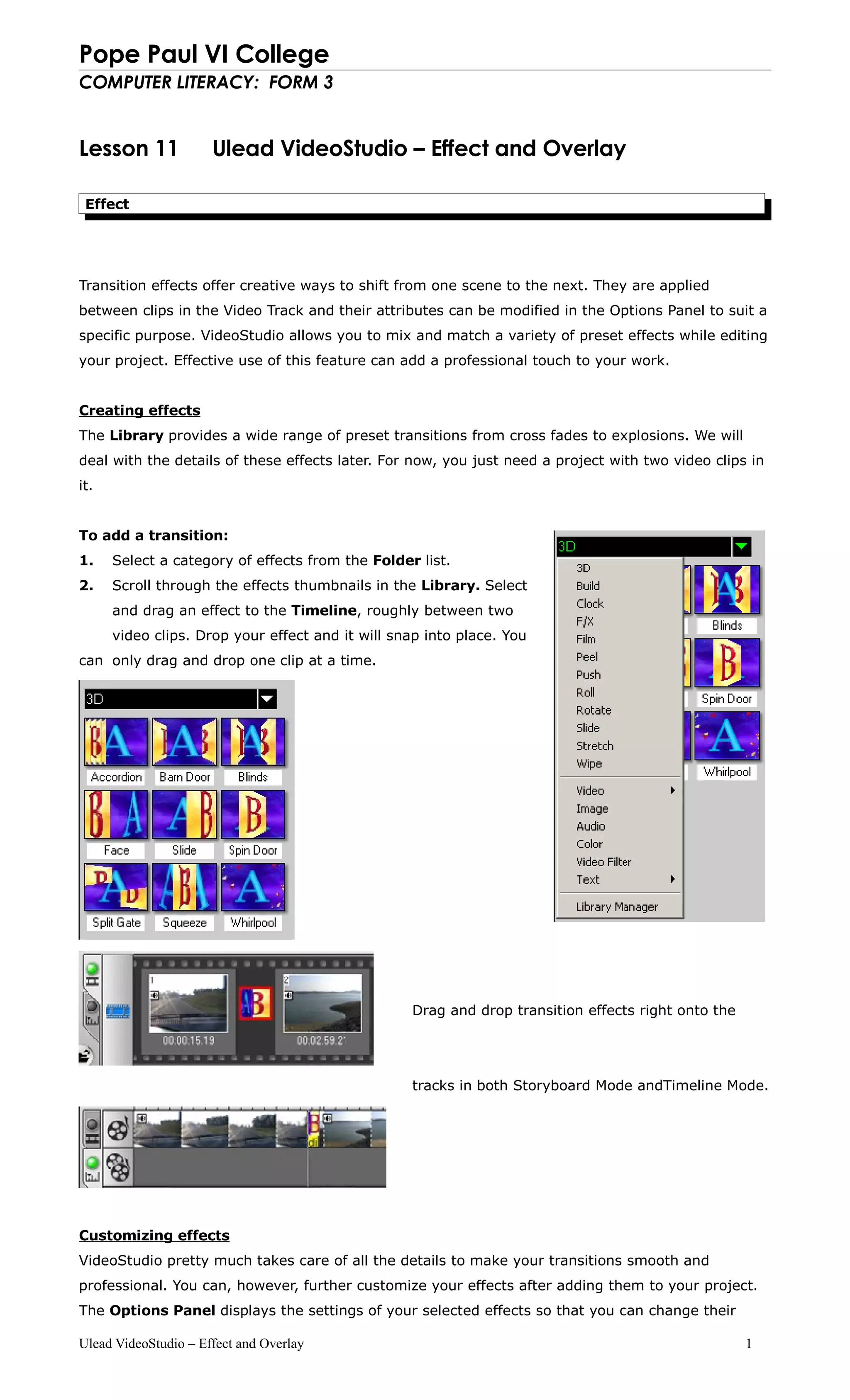 This document provides instructions on adding transition effects and overlays in Ulead VideoStudio. It discusses: 1. Transition effects that can be applied between video clips in the timeline to shift between scenes. These effects can be customized using the options panel. 2. The overlay track allows additional videos or images to be placed above video clips to enhance introductions or credits. Clips in the overlay track have automatic transparency. 3. Overlay clips can be inserted into the overlay track similar to inserting clips into the video track, and motion effects can be used to blend overlay clips with those in the video track.