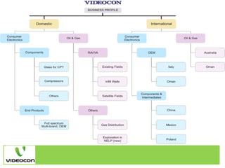 Videocon Group is an Indian conglomerate founded in 1979 that operates in consumer electronics, home appliances, oil and gas, and telecommunications. Some of its brands include Paramount, Sky Billion Trading, and Videocon Global. It has manufacturing facilities across India and pursues a strategy of backward integration and partnerships with global leaders. While appliances and oil/gas divisions have been profitable, its entertainment and finance segments have struggled. Videocon aims to expand into new areas like mobile and IT through R&D and competitive pricing.
