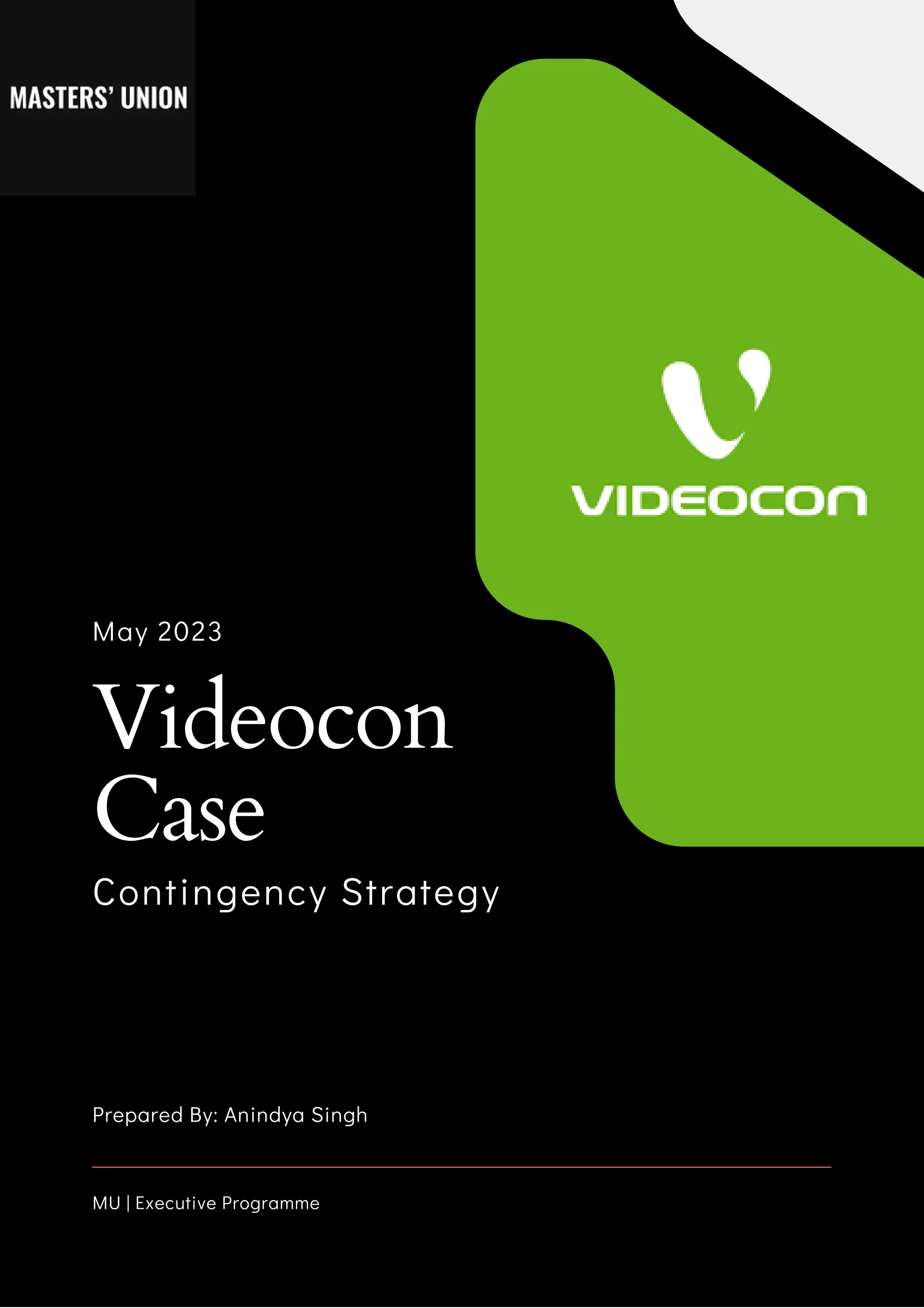 The document outlines a contingency strategy for Videocon Industries, detailing the company's decline due to reckless diversification, high debt, and competition. As the newly appointed CEO, Anindya Singh presents a turnaround plan focusing on divesting non-core businesses, digital transformation, and workforce optimization to boost profitability within a year. The financial plan estimates the transformation will require approximately INR 11 crore and emphasizes the importance of avoiding further debt while enhancing customer engagement and operational efficiency.