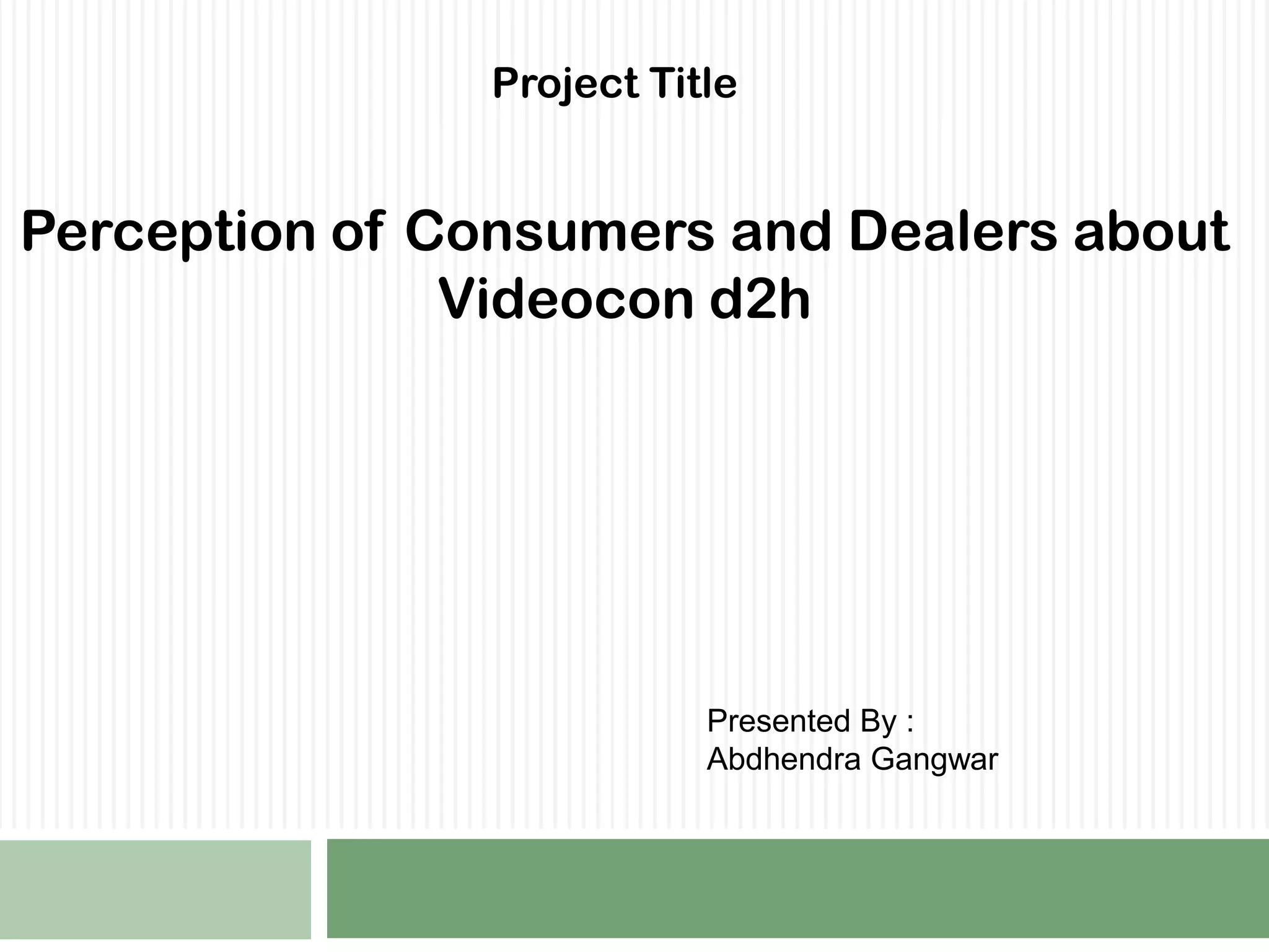 This document summarizes a research project about perceptions of consumers and dealers regarding Videocon d2h, an Indian direct-to-home satellite television provider. It provides background on Videocon d2h, including that it is a subsidiary of Videocon founded in 2009 with headquarters in Mumbai. The objectives of the project are to understand consumer responses to Videocon d2h, analyze data to provide conclusions and recommendations, and understand factors influencing consumer buying behavior and brand switching. The methodology included surveys of 50 dealers and 100 consumers in Faridabad, India. Key findings include that entry cost is a main purchase criterion and Videocon d2h has a 35% market share in Faridabad. Recommendations center on improved advertising
