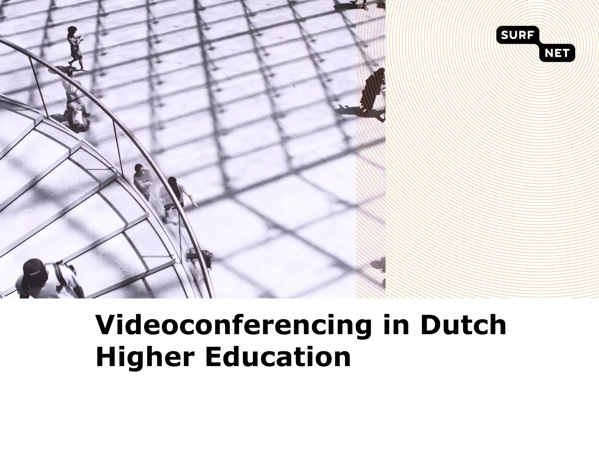 SURFnet is the Dutch National Research and Education Network (NREN) that provides network infrastructure and collaboration services to 160 connected institutions and 1 million end-users. SURFnet began offering videoconferencing services in 2001 and has expanded its services over time, including offering high-definition videoconferencing through its SURFcontact service since 2009. By 2012, SURFnet analyzed the commercial videoconferencing market in the Netherlands and determined it would transition its SURFcontact users to commercial vendors by the end of the year while continuing to focus on identity and collaboration services.