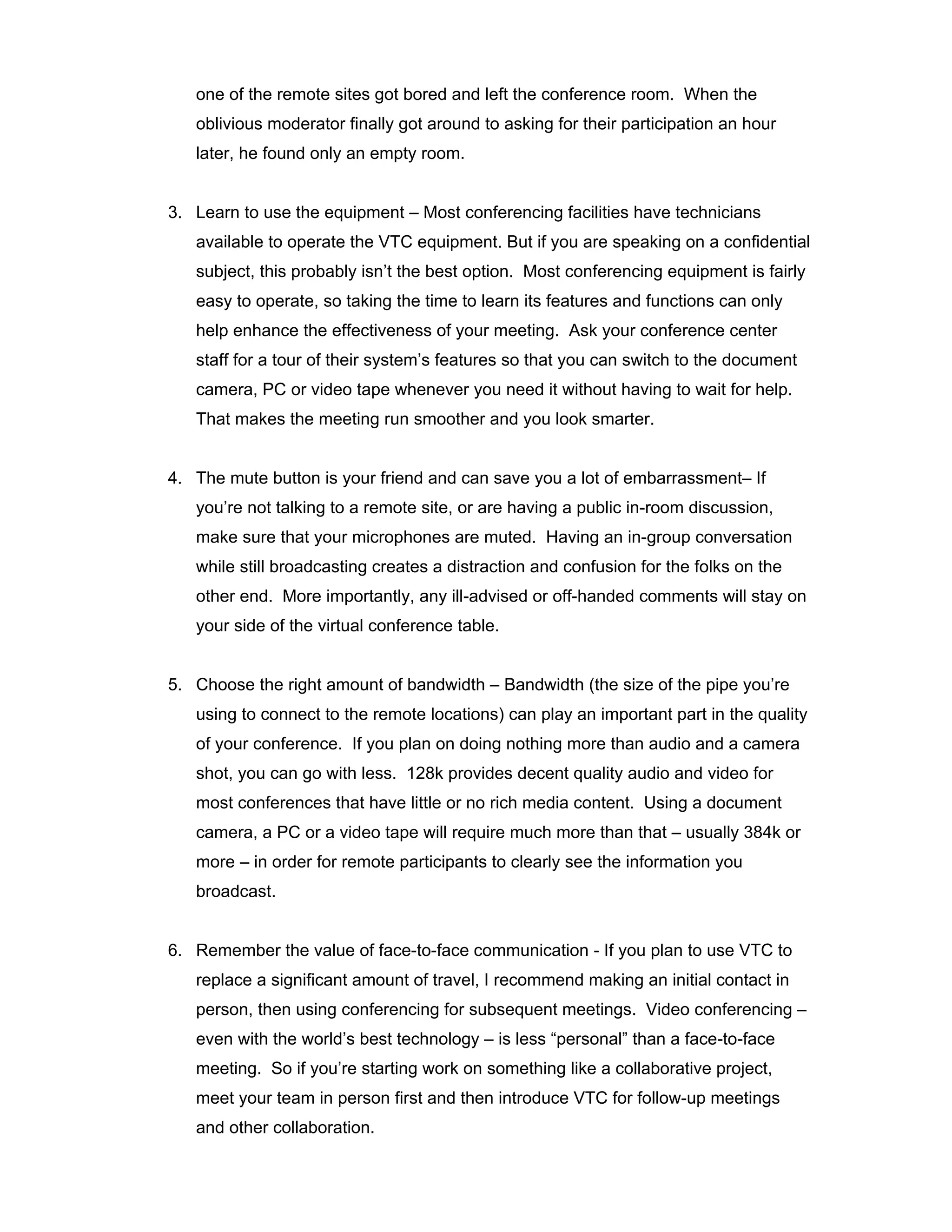 The document provides tips for successful videoconferencing. It recommends having an agenda distributed in advance, assigning a moderator to keep the meeting on schedule and allow equal participation, and learning how to use the videoconferencing equipment. It also suggests muting microphones when not speaking to avoid distractions, choosing the appropriate bandwidth based on content, and meeting in person initially if replacing significant travel with videoconferencing. Following these guidelines can help reduce travel expenses while allowing remote participation in important meetings and decisions.