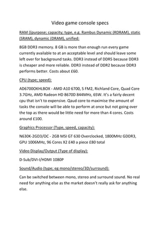 This document summarizes the key specifications for a video game console, including: