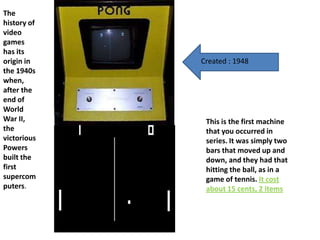The history of video games originated in the 1940s with simple machines featuring basic games like tennis. Later innovations included the introduction of Pac-Man in 1952, which incorporated a joystick and was one of the best-selling games ever. Home video game consoles then emerged in the 1950s, allowing games to be played at home on the television. Nintendo began producing home consoles in the 1960s and found great success selling to both children and adults. The PlayStation 1, created by two brothers, was the first non-Nintendo portable console and also achieved major commercial success in the 1990s. As technology advanced, the Nintendo 64 used improved graphics and dual joysticks to try to compete with the popular PlayStation in the late 1990