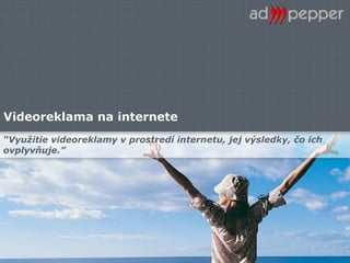 Výhody a nevýhodyvyužívania videospotov Výhody využívania videospotov v reláciách: Dobrá cieliteľnosť len na vybrané relácie Spot može byť totožný so spotom použitým v TV Vyššia kvalita samotného spotu Vždy zapnutý zvuk Prehratie spotu až do konca, jeho započítanie až so začiatkom relácie Obmedzenie prehratí užívateľovi (caping) Dĺžka až 60 sekúnd (v závislosti od stránky) Možnosť dodania spotu v ľubovoľnom formáte Nevýhody využívania video spotov v reláciach: Otravnosť samotnej reklamy Po reláciách možné zrušenie prehrávania spotu užívateľom Možnosť použiť len na serveroch, ktoré ponúkaju video obsah