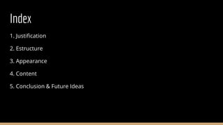 This document outlines the structure and plans for a website called Videoreptes.cat, which will provide reviews and reports on video games. It discusses justifying the name and logo, and describes the front-end structure including a home page, recent publications section, and about us page. It also covers the back-end structure using categories, entries, widgets, and Jetpack. The document discusses the site's appearance and content and concludes by listing future goals such as developing a visual theme, highlighting content, creating a YouTube channel, better organizing the recent publications page, adding more entries in different categories, and building a contact page.