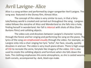 1) "Alice" by Avril Lavigne follows the storyline of Alice in Wonderland as Lavigne falls down a rabbit hole. High CGI is used to create the fairytale-like world.