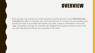 Videsh Consultz is an overseas education consultancy that assists students in studying abroad by providing services such as career counseling, visa guidance, and financial assistance. They focus on helping Indian students access top educational institutions in countries like the UK, Canada, Australia, and Germany, ensuring a smooth transition and successful enrollment. The company emphasizes transparency and quality service to help students achieve their academic and career aspirations.
