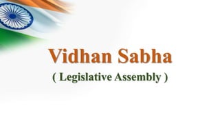 The document outlines the structure and functions of the legislative assembly in India, detailing the roles of the central and state governments, including the Lok Sabha and Vidhan Sabha. It describes the composition and powers of the Vidhan Sabha and its members (MLAs), as well as the eligibility and responsibilities of the Chief Minister. Additionally, it touches on the voting rights and registration processes for citizens.
