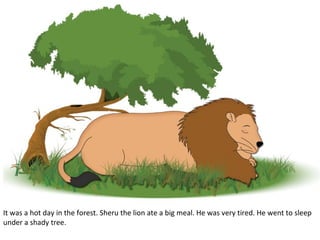 A lion named Sheru is napping under a tree when a mouse named Neetu begins playing on his tail and back without waking him. When Neetu dances on Sheru's head, Sheru wakes with a roar and catches Neetu. Neetu pleads for his life, saying he will be Sheru's friend. Sheru decides to let Neetu go since he is too small to eat. Later, hunters trap Sheru in a net and Neetu hears his friend's roar for help. Neetu bites through the net to free Sheru, proving that even small beings can help greater ones. Sheru and Neetu remain friends after Neetu's act of