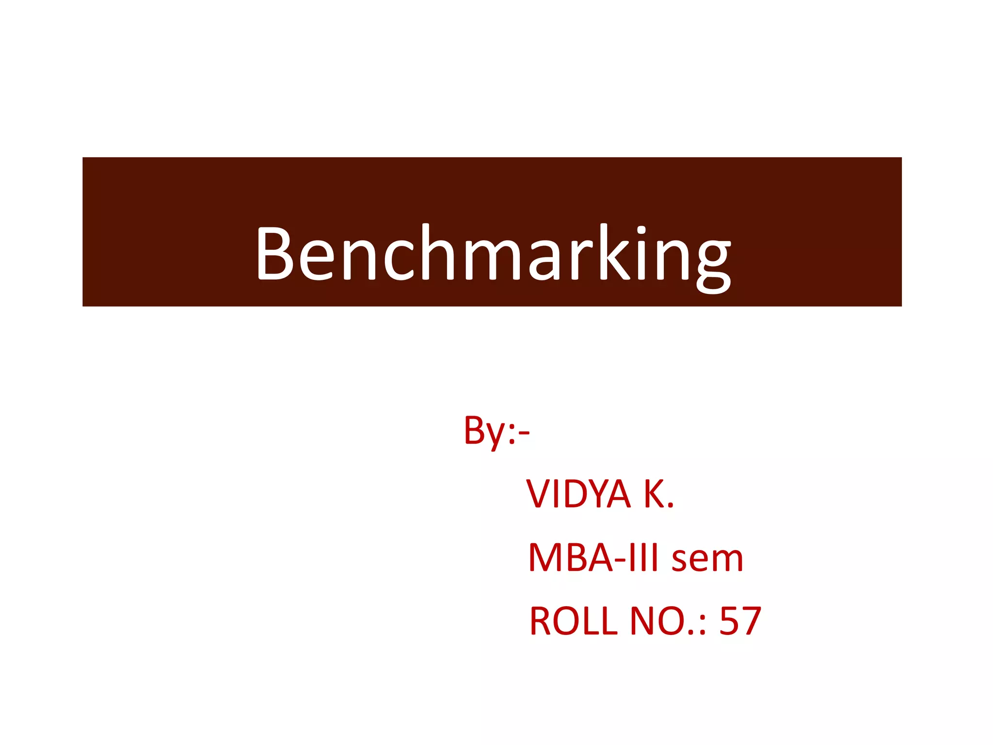 Benchmarking involves comparing a company's performance metrics to industry best practices to identify areas for improvement. It begins with researching other top performers to understand what processes and methods allow them to achieve high levels of efficiency and quality. Companies then adapt useful techniques, measure their own performance after implementing changes, and continue refining processes to strive toward industry leadership. Effective benchmarking requires establishing protocols to ethically gather information and protect proprietary data while collaborating with other organizations.