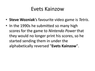 Evets KainzowSteve Wozniak’sfavourite video game is Tetris.In the 1990s he submitted so many high scores for the game to Nintendo Power that they would no longer print his scores, so he started sending them in under the alphabetically reversed "Evets Kainzow".