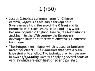1 (+50)Just as China isa common name for Chinese ceramic, Japan is an old name for Japanese Xware (made from the sap of the X Tree) and its European imitations. As Asian and Indian Xwork became popular in England, France, the Netherlands, and Spain in the 17th century the Europeans developed imitations that were effectively a different technique.
