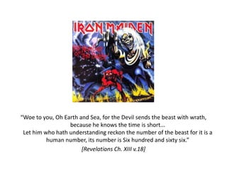 “Woe to you,Oh Earth and Sea, for the Devil sends the beast with wrath, because he knows the time is short...Let him who hath understanding reckon the number of the beast for it is a human number, its number is Six hundred and sixty six.”[Revelations Ch. XIII v.18]