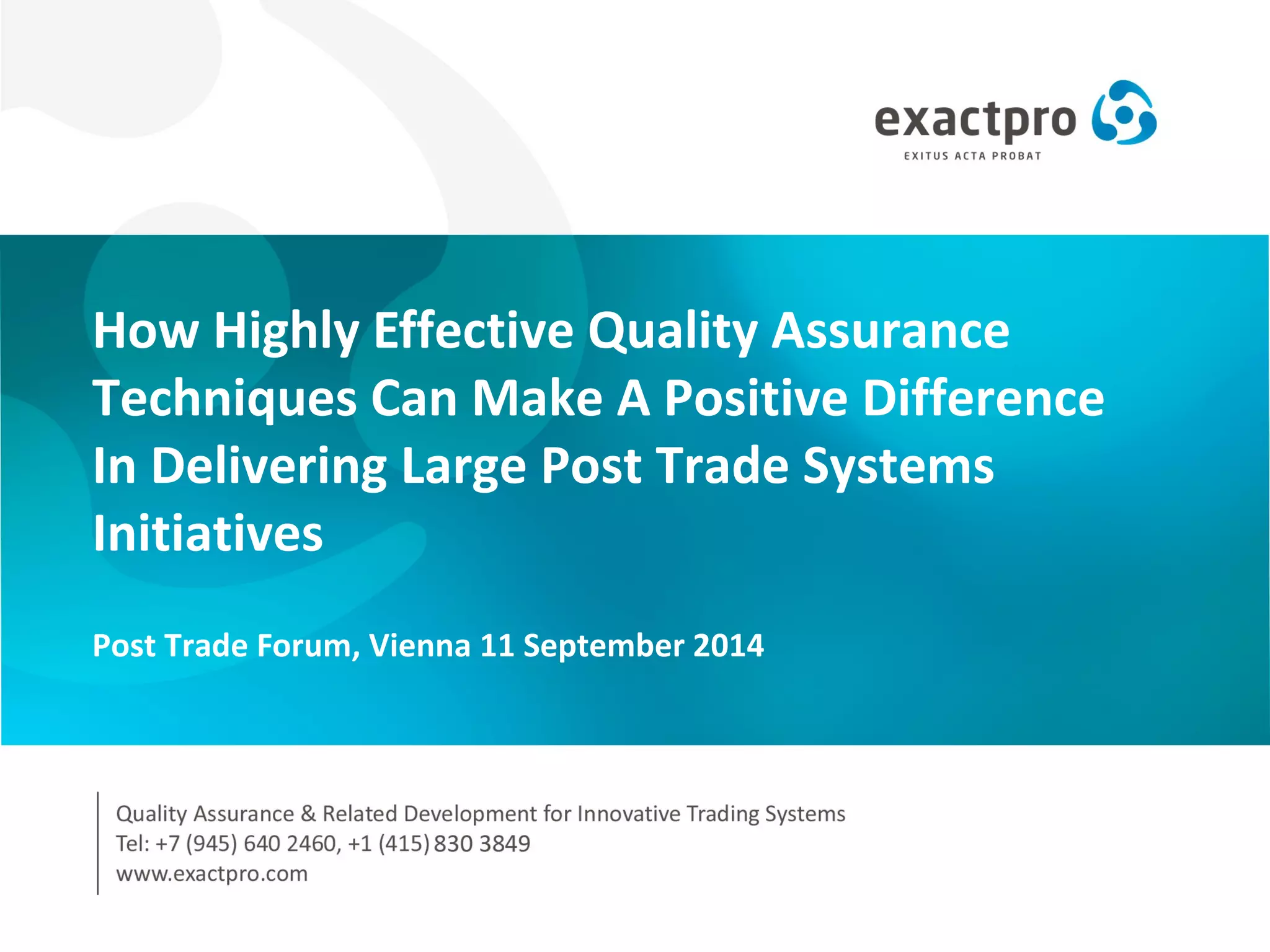 The document discusses effective quality assurance (QA) techniques in the context of large post-trade system initiatives, emphasizing the importance of high-quality staff, independent measurement, and efficient test processes. It outlines the challenges faced in post-trade testing, including complex multi-step scenarios and limited test availability, and proposes solutions such as automation and thorough planning. The conclusions stress that a well-functioning QA team enhances team dynamics and project outcomes significantly.