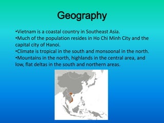 This document provides an overview of Vietnam, including its geography, climate, cities, food, dress, language, holidays, economy, sports, music, dance, history, and famous people. Vietnam is a Southeast Asian country with a tropical climate in the south and monsoonal climate in the north. The major cities are Hanoi and Ho Chi Minh City. The Vietnamese diet centers around rice, noodles, seafood, and vegetables. Traditional dress includes the conical leaf hat and the white ao dai uniform worn by schoolgirls. Vietnamese is a tonal language with words having different meanings based on tone. The economy has improved since joining the WTO in 1997 after suffering during years of war.