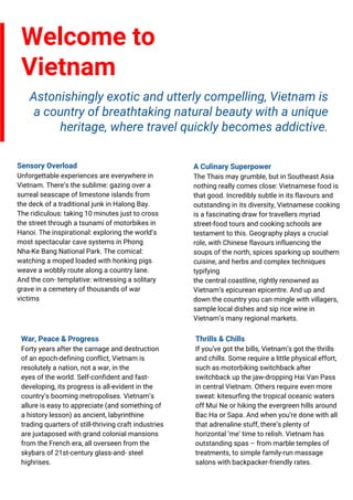 Vietnam is a captivating travel destination known for its stunning natural beauty, vibrant culture, and rich history. The country offers a unique blend of ancient traditions and modern advancements, with fantastic culinary experiences and thrilling outdoor activities available across various regions. Travelers are advised to be mindful of local customs, prepare for busy traffic, and engage with the friendly local communities while exploring Vietnam's diverse landscapes and attractions.