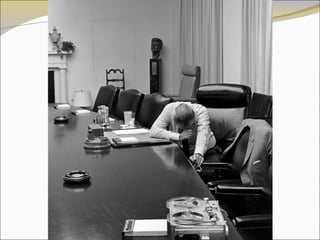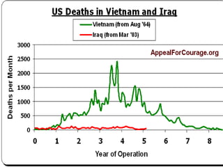 The document provides information about the Vietnam War and the anti-war movement in the United States during the 1960s and 1970s. It discusses growing public opposition to the war as casualties mounted and the credibility of the Johnson administration was questioned. Large protests erupted over the military draft, and divisions grew between those who supported continuing the war ("hawks") and those who wanted to withdraw ("doves"). Major events like the Tet Offensive of 1968 and the My Lai massacre undermined public support for the war further. The document outlines the Nixon administration's policies of Vietnamization and withdrawal of troops throughout the 1970s until the final fall of South Vietnam in 1975.