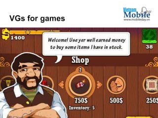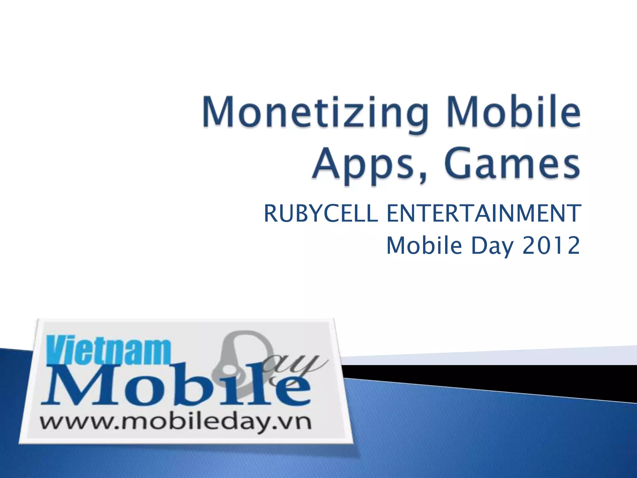 The document summarizes Do Quoc Khanh's presentation at Mobile Day 2012 for RubyCell Entertainment. Some key points from the presentation include discussing building a marketplace within a mobile app for selling virtual goods, subscriptions, and paid installations. The presentation also covered monetization strategies like in-app advertising, offerwalls that pay per installation, and case studies where these strategies have generated revenue. Overall, the document advocated developing new approaches to the subscription business model and creating a marketplace within a mobile app.