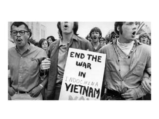 The document summarizes the key events of the Vietnam War from French colonization of Vietnam to the US involvement and withdrawal. It discusses how Vietnam was initially a French colony exporting goods. The Vietnamese people grew tired of French rule and Ho Chi Minh formed the Viet Min army to fight against French control. This led to war between the French and Viet Min forces. The US became involved due to anti-communist sentiments and helped the French fight against Ho Chi Minh's communist forces. This expanded into a war between the US and Viet Cong groups seeking independence, which saw heavy American casualties over years of guerilla warfare until the US ultimately withdrew from Vietnam.