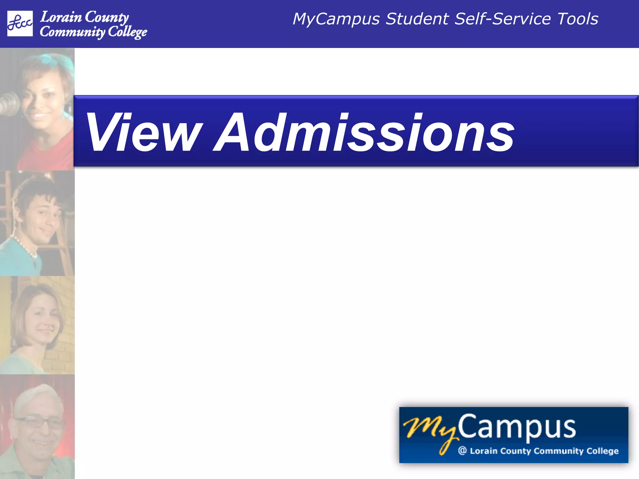 The document provides instructions for viewing the status of an admissions application in a student center by clicking the student center link, viewing any admissions or enrollment holds, and scrolling down to see the status of the application.