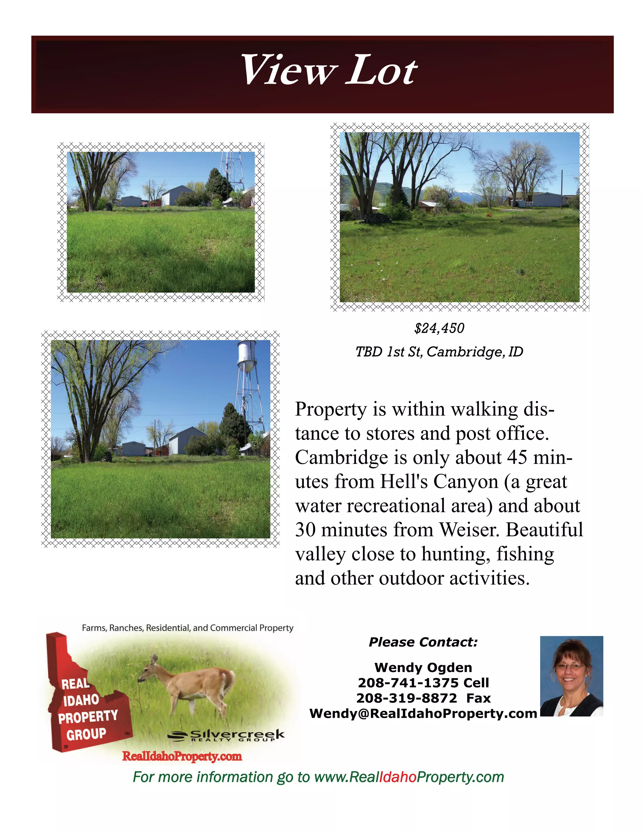 This document lists a property for sale in Cambridge, ID, with an asking price of $24,450 for a 10,000 sq ft lot. The location is near essential services, about 45 minutes from Hell's Canyon and offers access to recreational activities like hunting and fishing. The property has basic utilities available and allows manufactured homes, with no flood insurance required.