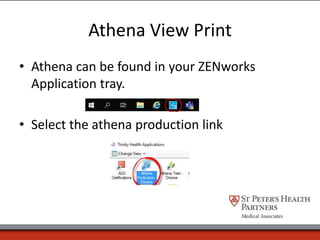 The document provides instructions for using the Athena View Print system to access and view patient medical records. It describes how to log in to Athena, search for a patient, open their chart, navigate within the chart to find different types of clinical information, and print documents. The key steps are to log in to Athena, search for a patient, open their chart which displays recent information, use the left navigation to find specific records, and print documents using the print options at the top of pages.